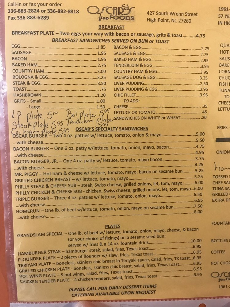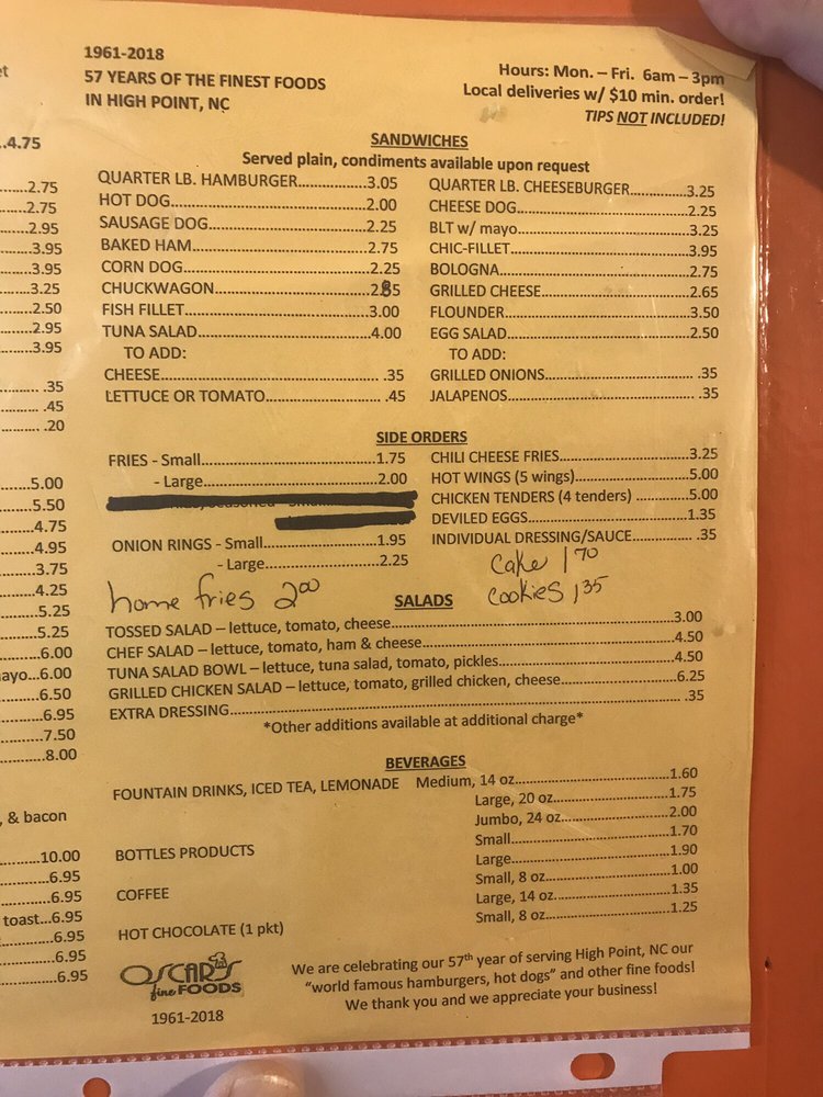 Introducing the menu at Oscar's Fine Foods, a hotspot in High Point known for its delicious hot dogs and burgers. The specialty sandwich, Oscar Burger, features 2 oz. patties with lettuce, tomato, onion, and mayo. For bacon lovers, the Bacon Burger offers a 6 oz. patty with additional bacon toppings. Customers rave about the fresh fries, friendly service, and iconic atmosphere. Reviews mention the must-try NC style red hot dogs, chili dogs, and hamburgers. The Grand Slam burger is a favorite among many, while traditional favorites like bologna sandwiches satisfy cravings. With a focus on traditional, home-cooked meals at reasonable prices, Oscar's has been a local treasure for over 60 years. The welcoming staff and cozy atmosphere make dining at Oscar's feel like a family gathering. Don't miss out on this hidden gem in High Point for a hearty meal that won't break the bank.